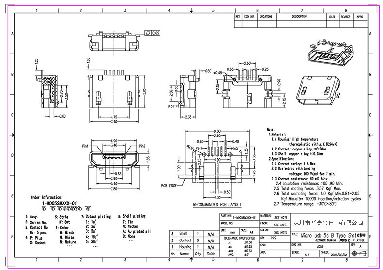 Micro USB母座 5Pin 板上全貼 手機連接器