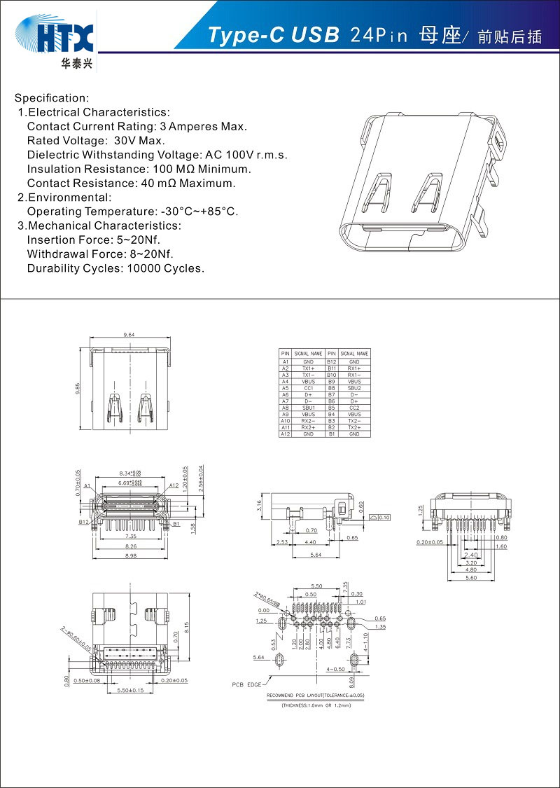 Type-C母座 24Pin 前插后貼 TypeC連接器母座